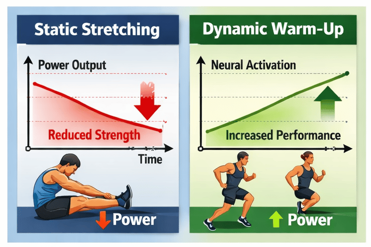 Athletes who perform dynamic movement patterns show improved sprint times and jump performance versus static stretch protocols pre-event.